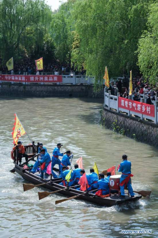 A traditional rowing race in worship of Canshen, the local patron god of silkworm raisers, is seen during a temple fair at Qinghe Village, Zhouquan Township, Tongxiang City of east China's Zhejiang Province, April 4, 2021. (Xinhua/Xu Yu)