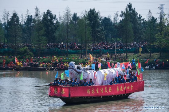 A festive boat procession in worship of Canshen, the local patron god of silkworm raisers, is seen during a temple fair at Qinghe Village, Zhouquan Township, Tongxiang City of east China's Zhejiang Province, April 4, 2021. (Xinhua/Xu Yu)