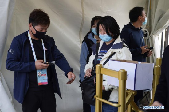 A staff checks tickets at the entrance of the Wukesong Sports Center in Beijing, April 4, 2021. More than one thousand spectators were invited to watch the match to stress test the venue operation. A 10-day ice sports test program for the 2022 Olympic and Paralympic Winter Games is held from April 1 to 10, 2021. This test program is to give a test to competition organization, venue operation, and services and safeguarding. It will engage all ice sports of Beijing 2022, namely short track speed skating, speed skating, figure skating, ice hockey, curling, para ice hockey and wheelchair curling. (Xinhua/Peng Ziyang)