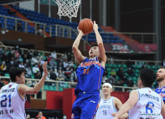 Qi Lin (2nd L) of Xinjiang Flying Tigers goes to the basket during the 52nd round match between Xinjiang Flying Tigers and Jiangsu Dragons at the 2020-2021 season of the Chinese Basketball Association (CBA) league in Zhuji, east China's Zhejiang Province, April 4, 2021. (Xinhua/Weng Xinyang)