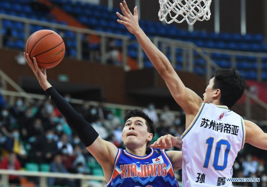 Abdusalam Abdurexit (L) of Xinjiang Flying Tigers goes to the basket during the 52nd round match between Xinjiang Flying Tigers and Jiangsu Dragons at the 2020-2021 season of the Chinese Basketball Association (CBA) league in Zhuji, east China's Zhejiang Province, April 4, 2021. (Xinhua/Weng Xinyang)