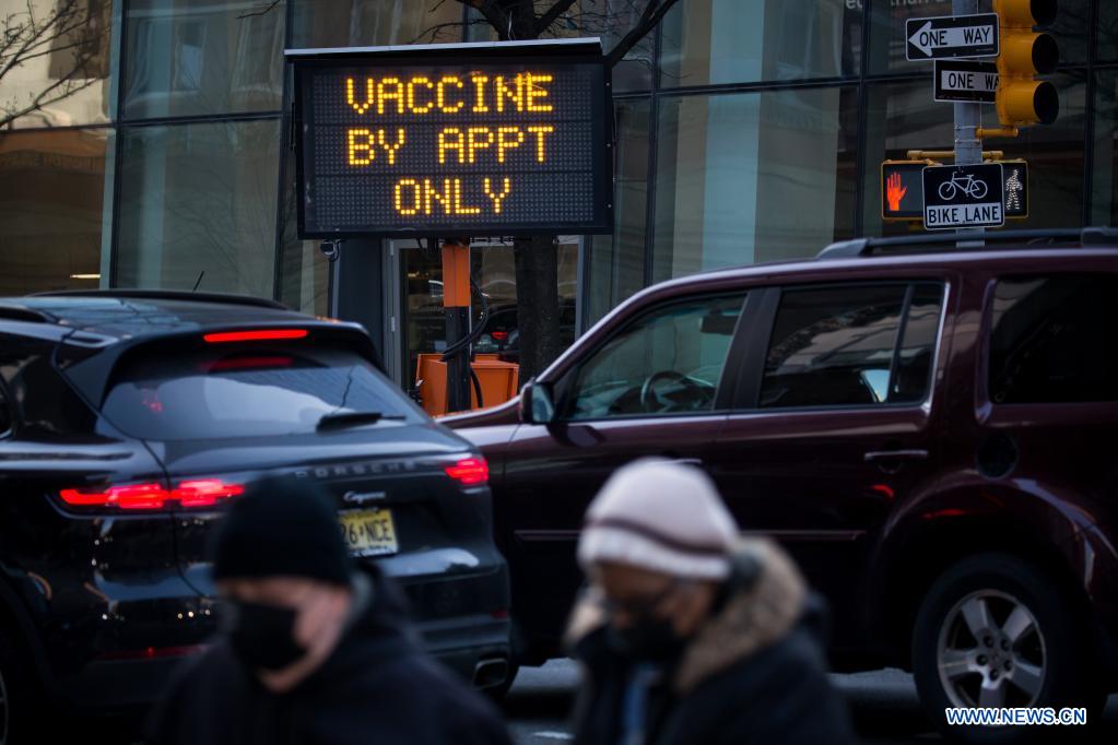 People pass a sign advertising a COVID-19 vaccination site at the Javits Center in New York, United States, April 6, 2021. U.S. President Joe Biden announced Tuesday that all American adults will be eligible for COVID-19 vaccine by April 19. About 168 million COVID-19 vaccine shots have been administered as of Tuesday, while more than 219 million COVID-19 vaccine doses have been distributed across the country, CDC data show. (Photo by Michael Nagle/Xinhua)