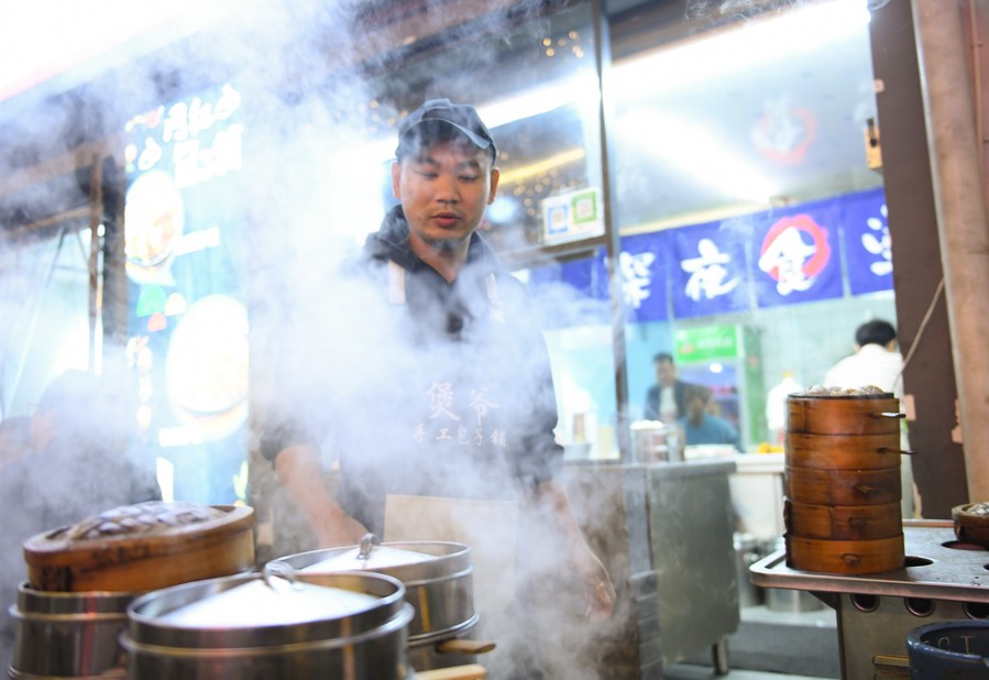 A staff member works in a restaurant at a night market in Shouchang Township of Jiande City, east China's Zhejiang Province, Nov. 10, 2020. (Xinhua/Weng Xinyang)