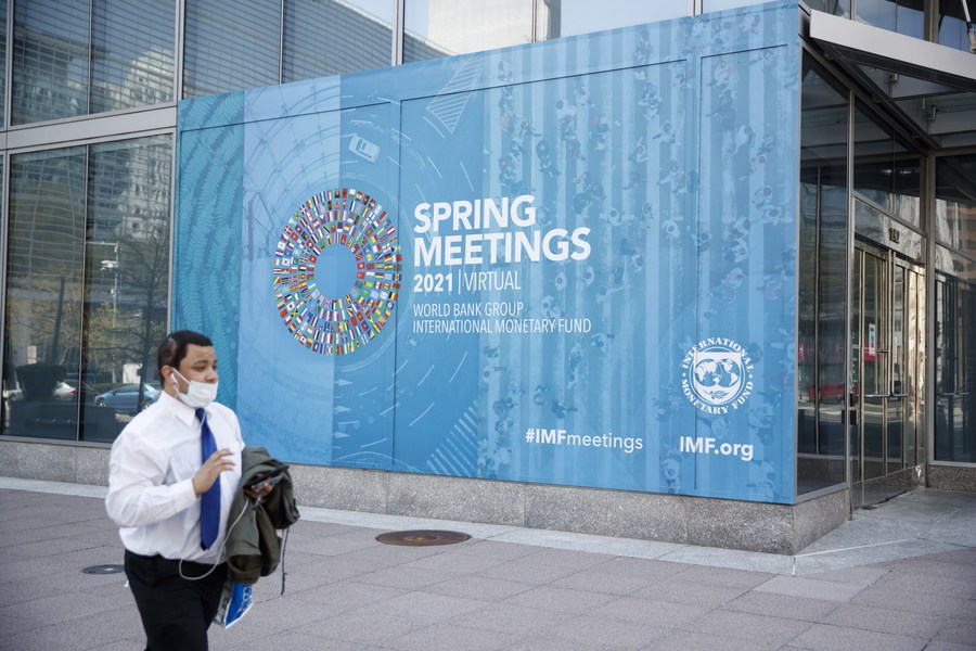 A man walks past the International Monetary Fund headquarters in Washington, D.C., the United States, on April 6, 2021. (Photo by Ting Shen/Xinhua)