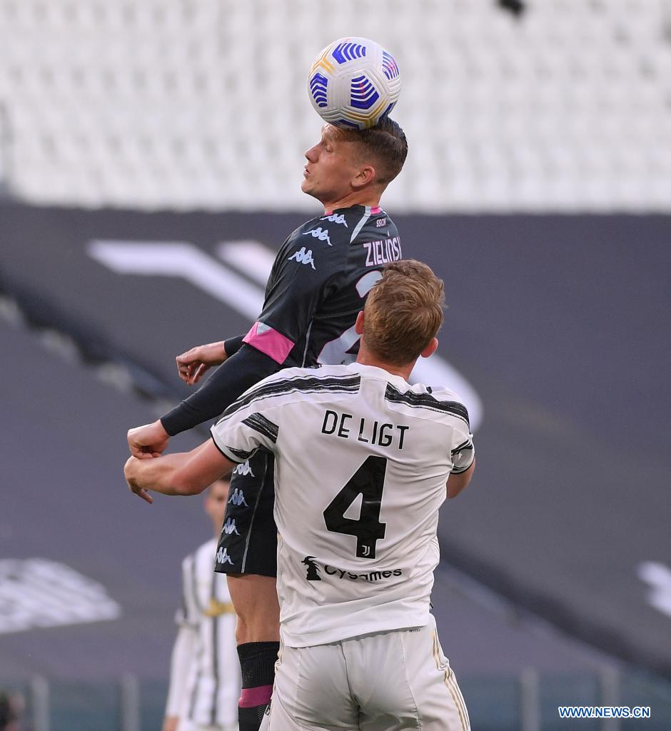 FC Juventus' Matthijs De Ligt (R) vies with Napoli's Piotr Zielinski during a serie A football match between FC Juventus and Napoli in Turin, Italy, April 7, 2021. (Photo by Federico Tardito/Xinhua)