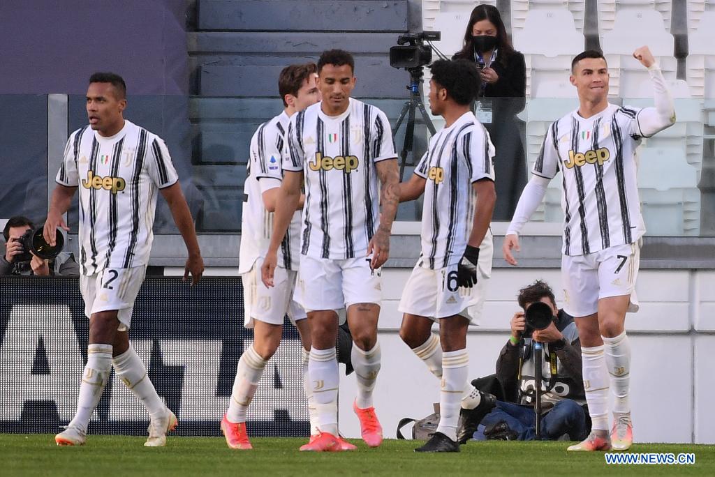 FC Juventus' Cristiano Ronaldo (1st R) celebrates his goal during a serie A football match between FC Juventus and Napoli in Turin, Italy, April 7, 2021. (Photo by Federico Tardito/Xinhua)