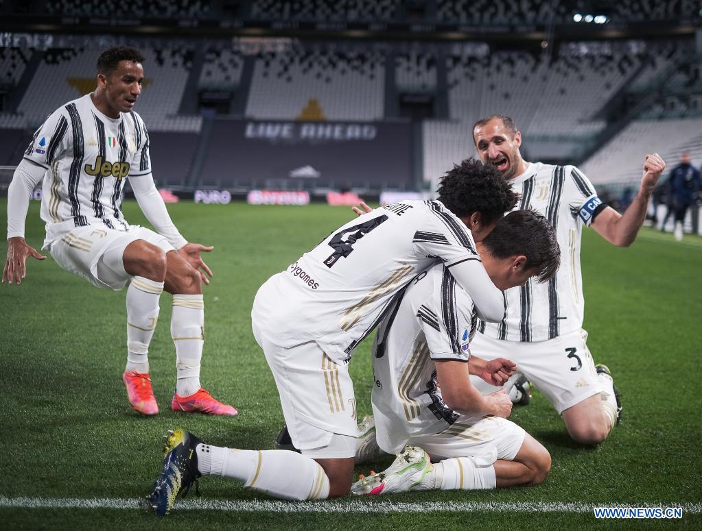 FC Juventus' Paulo Dybala (R, front) celebrates his goal with his teammates during a serie A football match between FC Juventus and Napoli in Turin, Italy, April 7, 2021. (Photo by Federico Tardito/Xinhua)