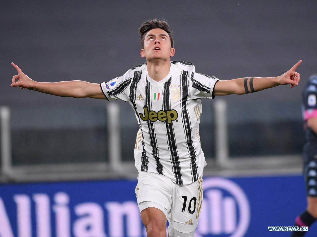 FC Juventus' Paulo Dybala celebrates during a serie A football match between FC Juventus and Napoli in Turin, Italy, April 7, 2021. (Photo by Federico Tardito/Xinhua)
