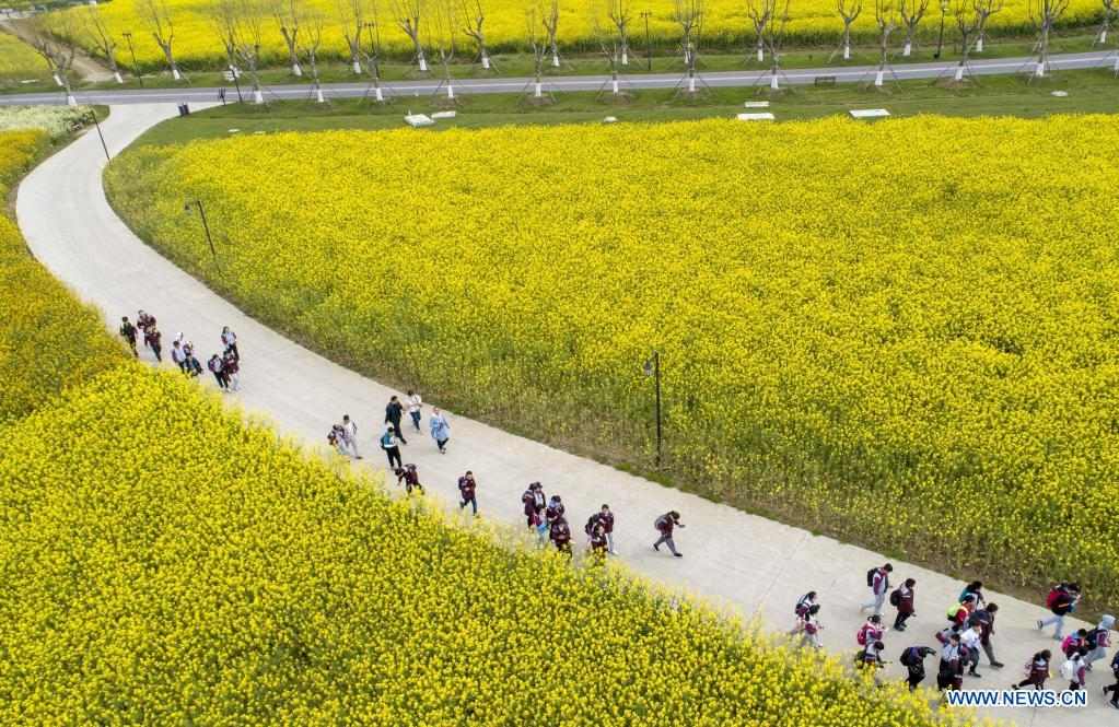 Students enjoy flowers in Huai'an, east China's Jiangsu Province, April 7, 2021. (Photo by He Jinghua/Xinhua)