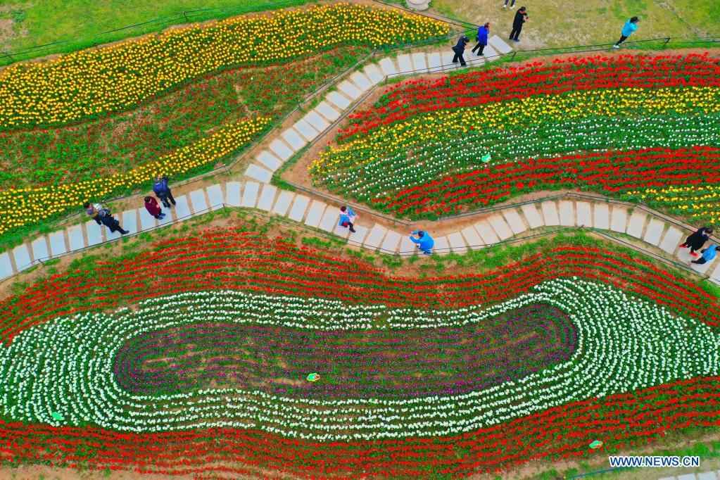 Aerial photo taken on April 7, 2021 shows tourists enjoying flowers in Xianyang Lake scenic area in Xianyang, northwest China's Shaanxi Province. (Photo by Li Junchao/Xinhua)