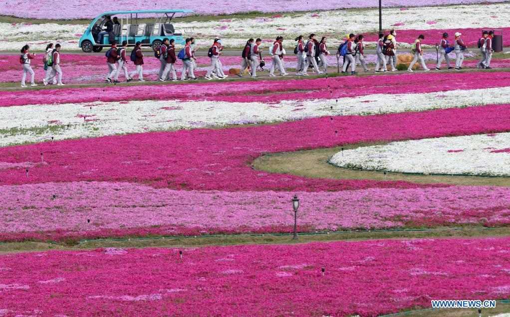 Students enjoy flowers in Huai'an, east China's Jiangsu Province, April 7, 2021. (Photo by He Jinghua/Xinhua)