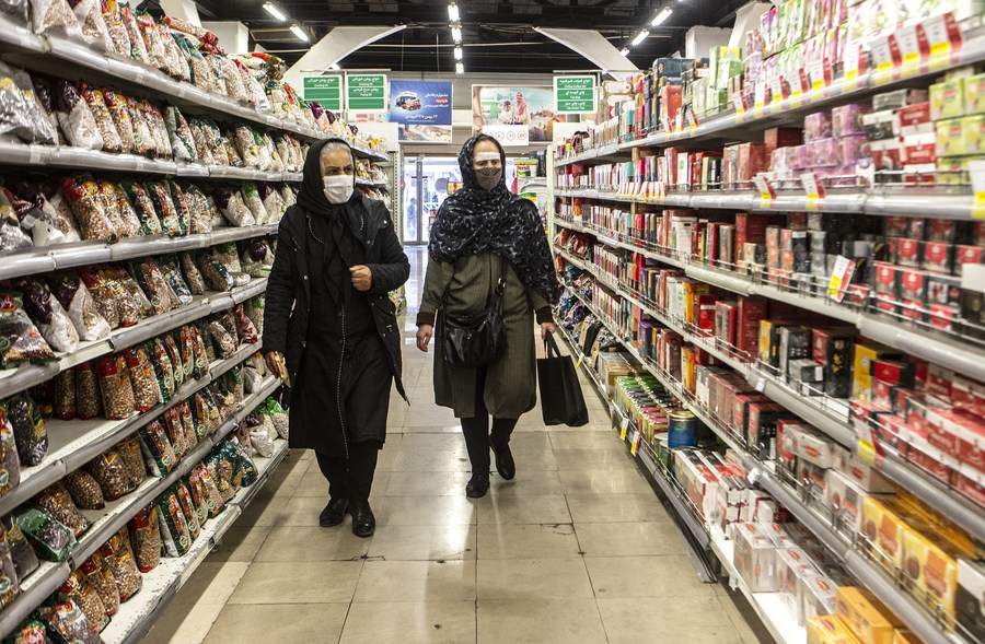 A woman and her daughter wearing face masks walk in a supermarket in Tehran, capital of Iran, on April. 4, 2021. (Xinhua/Ahmad Halabisaz)
