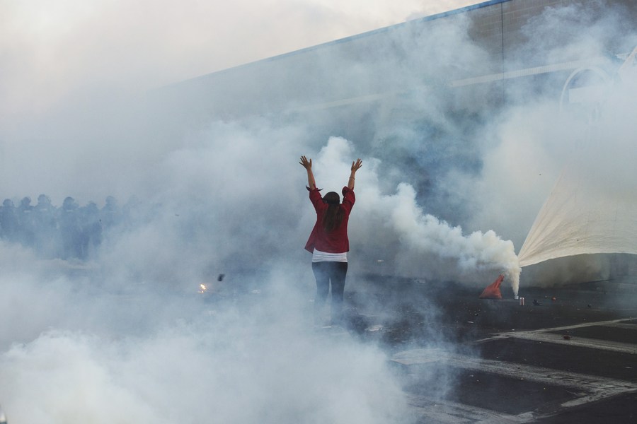 A woman raises her arms as riot police fire tear gas during a protest outside the 5th Police Precinct in Minneapolis, the United States, on May 30, 2020. (Photo by Angus Alexander/Xinhua)