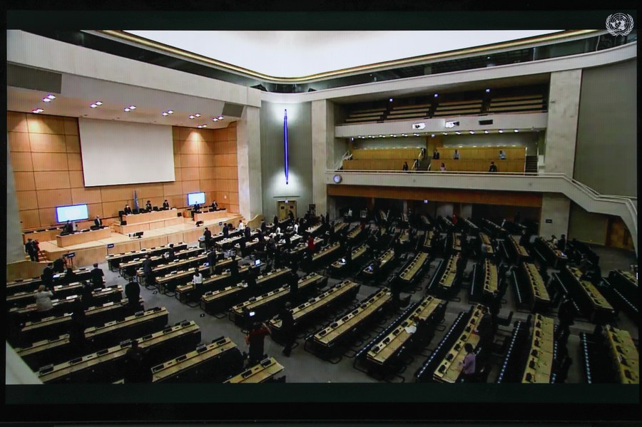 Photo taken on June 17, 2020 in Brussels, Belgium shows a screen that displays the 43rd Regular Session of the UN Human Rights Council held in Geneva, Switzerland. (Xinhua/Zheng Huansong)