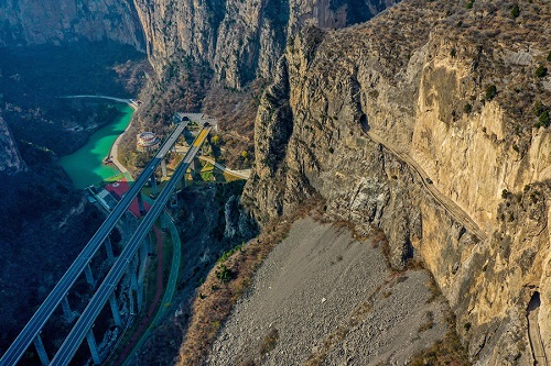 A dramatic aerial photo taken on Nov 12, 2020 shows an expressway (left) and a highway (right) hugging the side of a cliff in North China's Shanxi province. The expressway provides a convenient path to Hongni village, which is deep in the Taihang Mountains. As the expressway opened to traffic, the village started to develop tourism, photovoltaic power generation, and grain processing industries that have effectively broadened the channels for villagers to increase their incomes. By the end of 2018, all people in the village had been lifted out of poverty. [Photo/Xinhua]