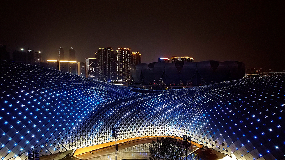 The stadium and natatorium are connected to form a single building, which is the world’s largest building with nonlinear design formed by two venues. The comprehensive training center is in the shape of cong, jade tubes with quadrilateral exteriors. It represents the largest building in the world that resembles cong, which is a typical type of jade object unearthed from the Liangzhu Archaeological Site in Hangzhou.