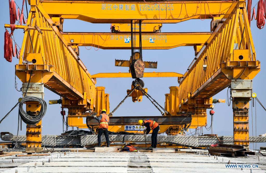 Workers are busy at the construction site of Zhenluo Yellow River Bridge in Zhongwei City, northwest China's Ningxia Hui Autonomous Region, April 11, 2021. The 1,289-meter-long Zhenluo Yellow River Bridge in the Ningxia section of the Wuhai-Maqin expressway finished its final stage for closure Sunday. (Xinhua/Feng Kaihua)
