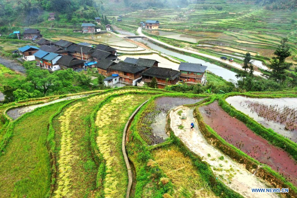Aerial photo shows a farmer working in the field in Rongjiang County, Qiandongnan Miao and Dong Autonomous Prefecture, southwest China's Guizhou Province, April 11, 2021. (Photo by Wang Bingzhen/Xinhua)