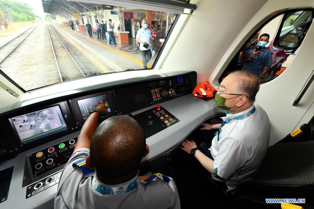 Malaysian Transport Minister Wee Ka Siong (R) takes a ride on the Diesel Multiple Unit train in Kota Bharu, the capital of Malaysia's northern Kelantan state, April 11, 2021. The Diesel Multiple Unit (DMU) trains manufactured by China Railway Rolling Stock Corporation (CRRC) Zhuzhou Electric Locomotive Co., Ltd were launched into operations on Sunday, which will boost connectivity and facilitate travel in Malaysia's eastern coast area. (Xinhua/Zhu Wei)