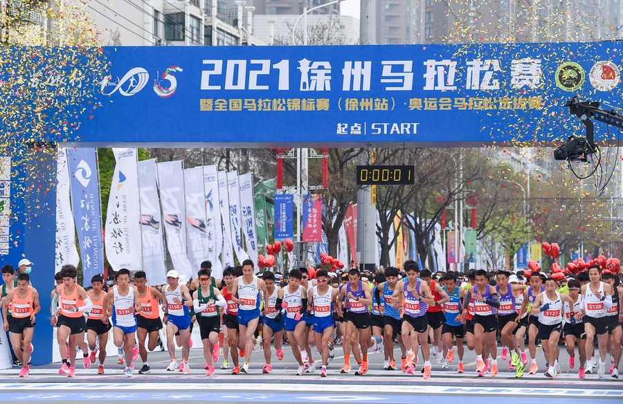 The mass start of men's race in Xuzhou Marathon on April 11, 2021. (Xinhua/Li Bo)
