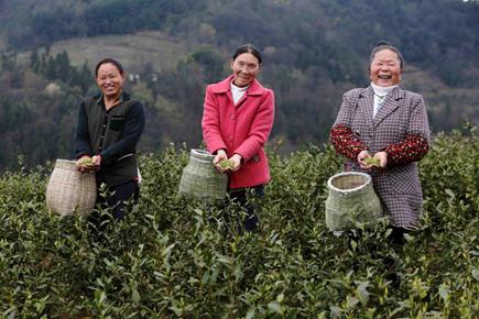 Villagers pick tea leaves at a poverty alleviation plantation in Shuangshi village, Zhongtang Township, Qianjiang District, southwest China's Chongqing Municipality, March 11, 2021. (People's Daily Online/Yang Min)