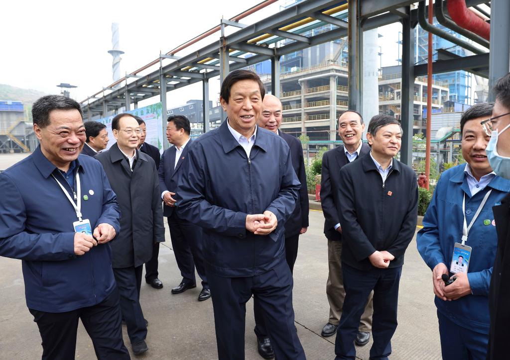 Li Zhanshu, a member of the Standing Committee of the Political Bureau of the Communist Party of China Central Committee and chairman of the National People's Congress Standing Committee, learns about the safe disposal and recycling of industrial waste slag at a zinc industry company in Hanzhong, northwest China's Shaanxi Province, April 11, 2021. Li inspected the enforcement of the Law on Prevention and Control of Environmental Pollution by Solid Waste in Shaanxi Province from April 9 to 13. (Xinhua/Huang Jingwen)