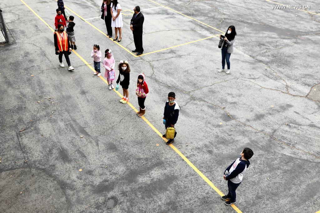 Students stand with a physical distance in a school in Los Angeles, California, the United States, on April 13, 2021. Since the outbreak of the COVID-19 pandemic for the first time in more than a year, some Los Angeles schools reopened for in-person classes on Tuesday. Safety standards and mandatory COVID-19 testing of students were in place, but many parents still opted to keep their kids learning from home. (Xinhua)