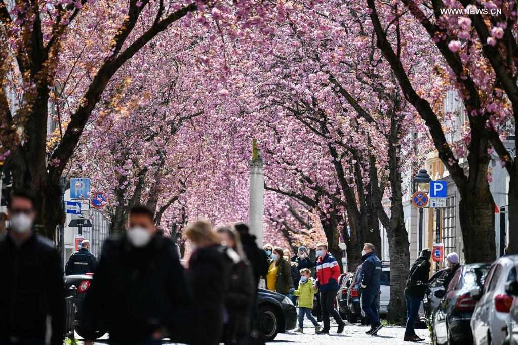 Visitors enjoy the sight of blooming cherry trees in Bonn, western Germany, April 13, 2021. (Photo by Ulrich Hufnagel/Xinhua)