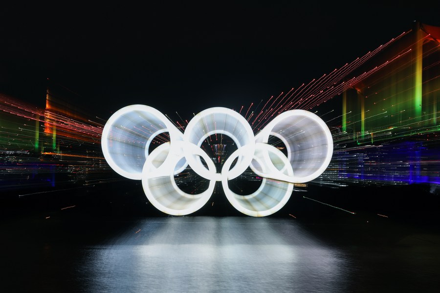 The illuminated Olympic rings, Rainbow Bridge and Tokyo Tower are seen at Tokyo Bay area, in Tokyo, Japan, Dec. 1, 2020. (Xinhua/Du Xiaoyi)