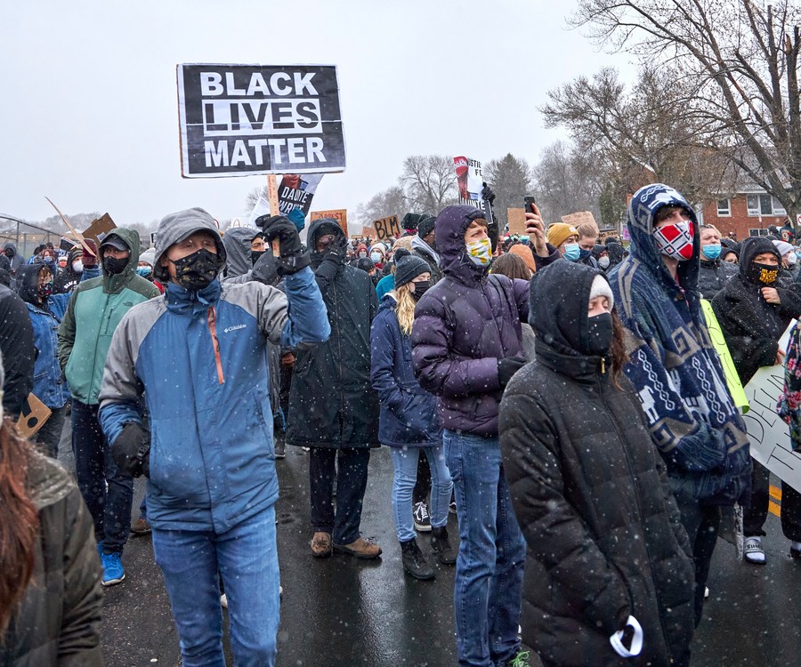 Protesters gather outside the Brooklyn Center Police Department in Brooklyn Center, Minnesota, the United States, April 13, 2021.(Photo by Matthew McIntosh/Xinhua)