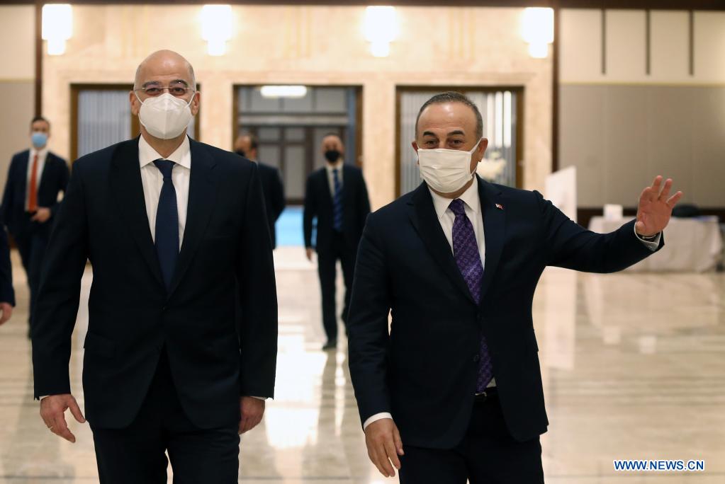 Turkish Foreign Minister Mevlut Cavusoglu (R) meets with Greek Foreign Minister Nikos Dendias in Ankara, Turkey, on April 15, 2021. Turkey believes that its issues with Greece can be resolved through constructive dialogue between the two neighbors and allies, Turkish Foreign Minister Mevlut Cavusoglu said Thursday. (Photo by Mustafa Kaya/Xinhua)