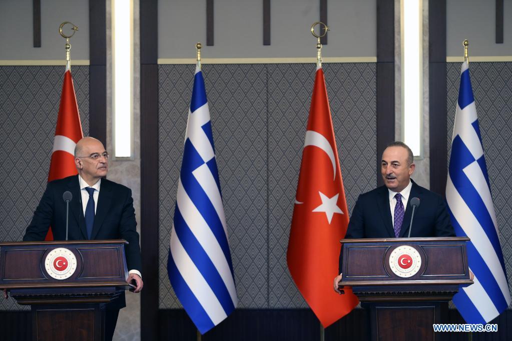 Greek Foreign Minister Nikos Dendias (L) and Turkish Foreign Minister Mevlut Cavusoglu attend a joint press conference in Ankara, Turkey, on April 15, 2021. Turkey believes that its issues with Greece can be resolved through constructive dialogue between the two neighbors and allies, Turkish Foreign Minister Mevlut Cavusoglu said Thursday. (Photo by Mustafa Kaya/Xinhua)