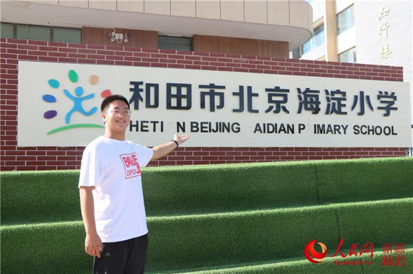 Wei Hengbo, a teacher of the Hetian Beijing Haidian Primary School, northwest China's Xinjiang Uygur autonomous region, poses for a photo in front of the school. When he was still in college, he already volunteered to teach in Xinjiang. (Photo/People’s Daily Online)