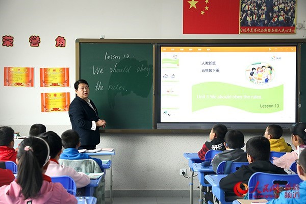 A teacher from Beijing teaches students English via multimedia means at the Hetian Beijing Haidian Primary School, northwest China's Xinjiang Uygur autonomous region. (Photo/People’s Daily Online)