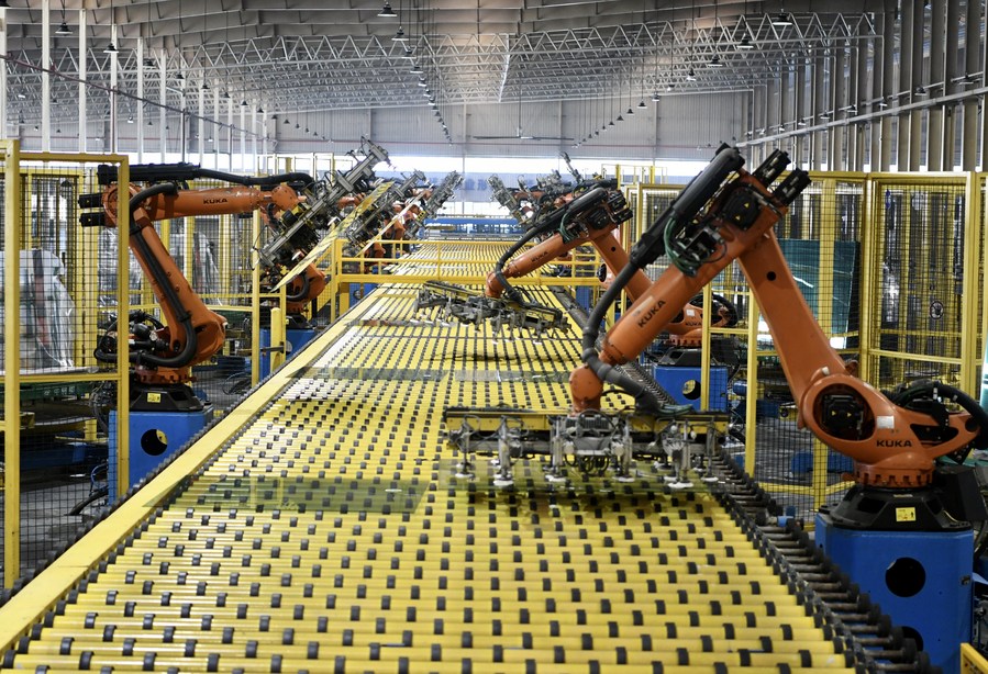 Robots operate on a production line at an automotive glass workshop of the Fuyao Glass Industry Group Co., Ltd. in Fuqing City of Fuzhou, southeast China's Fujian Province, Jan. 12, 2021.(Xinhua/Jiang Kehong)