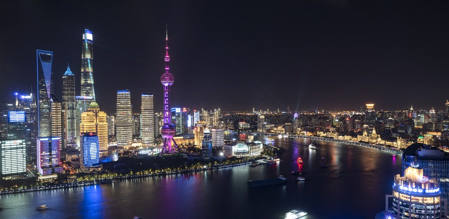 Photo taken on Nov. 4, 2020 shows a light show at the Lujiazui area in Shanghai, east China. (Xinhua/Zhang Haofu)