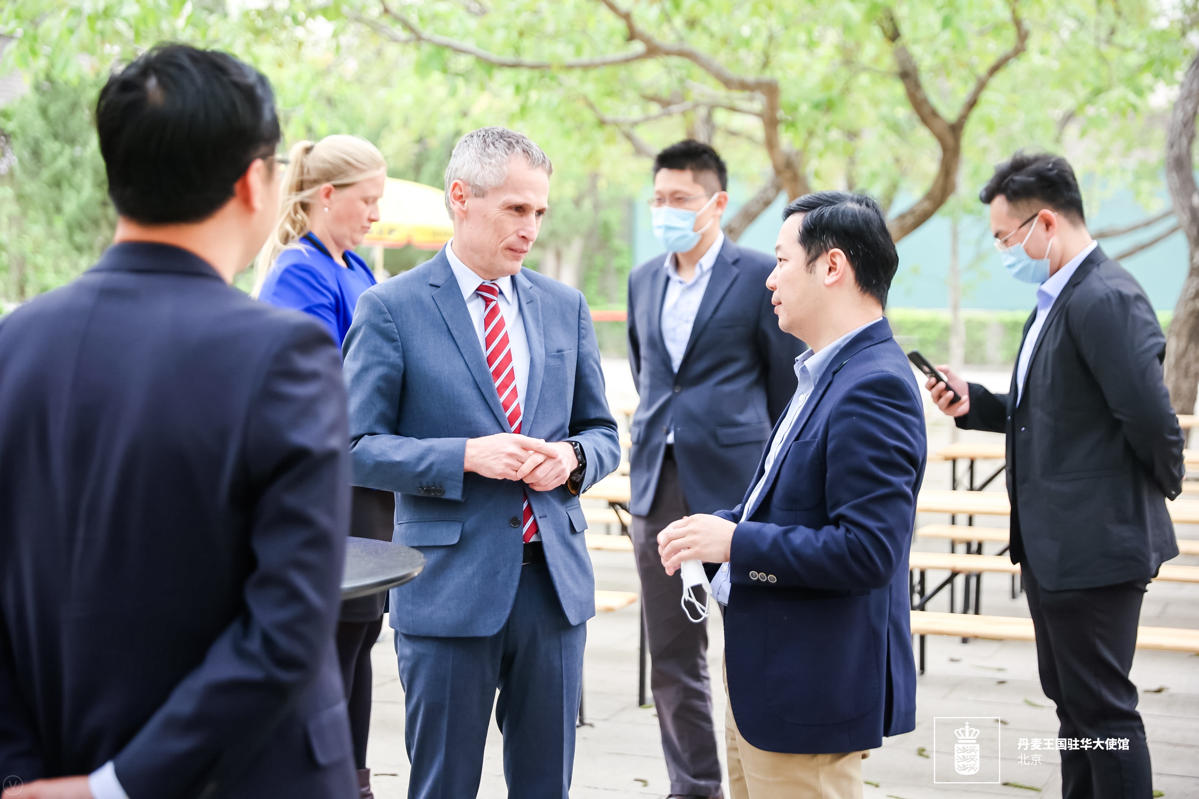 Thomas ?strup M?ller (center), Ambassador of the Kingdom of Denmark to the People's Republic of China, chats with guests at the 100-year birthday party of Danish P?lsevogn (hotdog stands) in Beijing, April 15, 2021. (Photo/Courtesy of the Embassy of the Kingdom of Denmark)