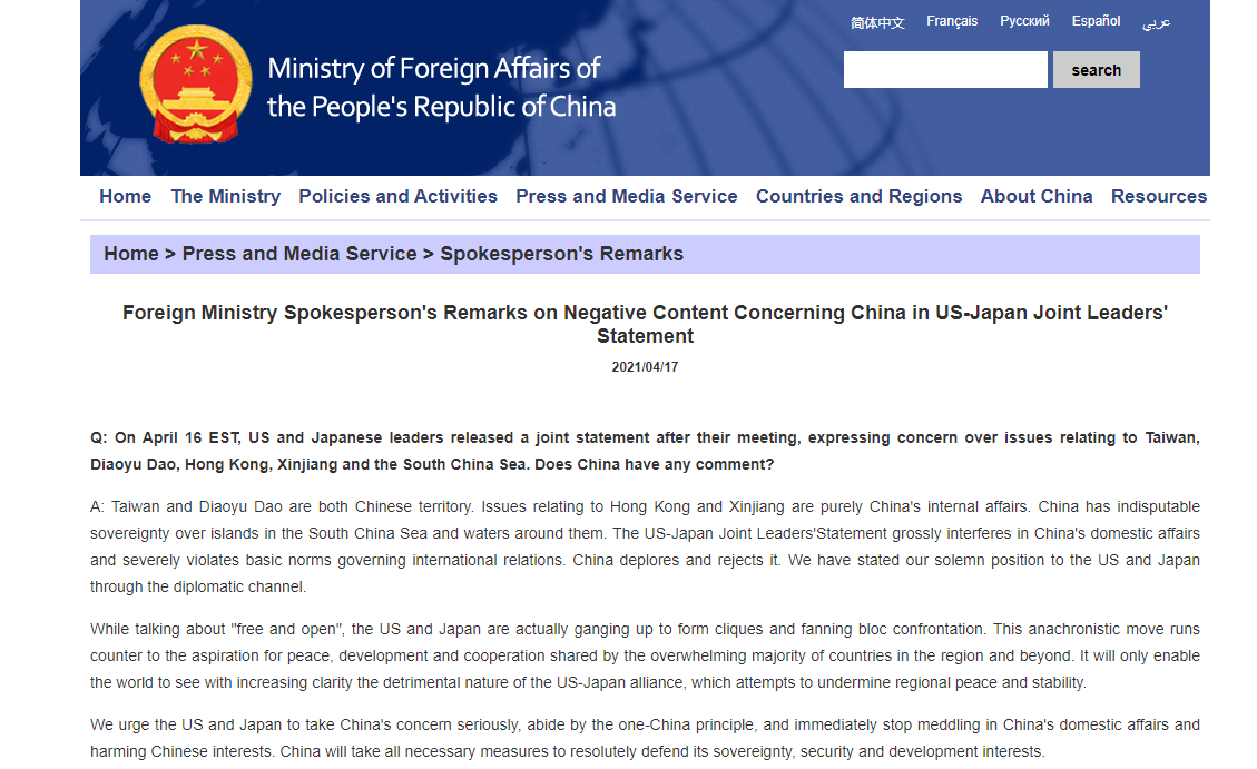 The spokesperson stressed that the U.S.-Japan joint leaders' statement has grossly interfered in China's domestic affairs and severely violated basic norms governing international relations.