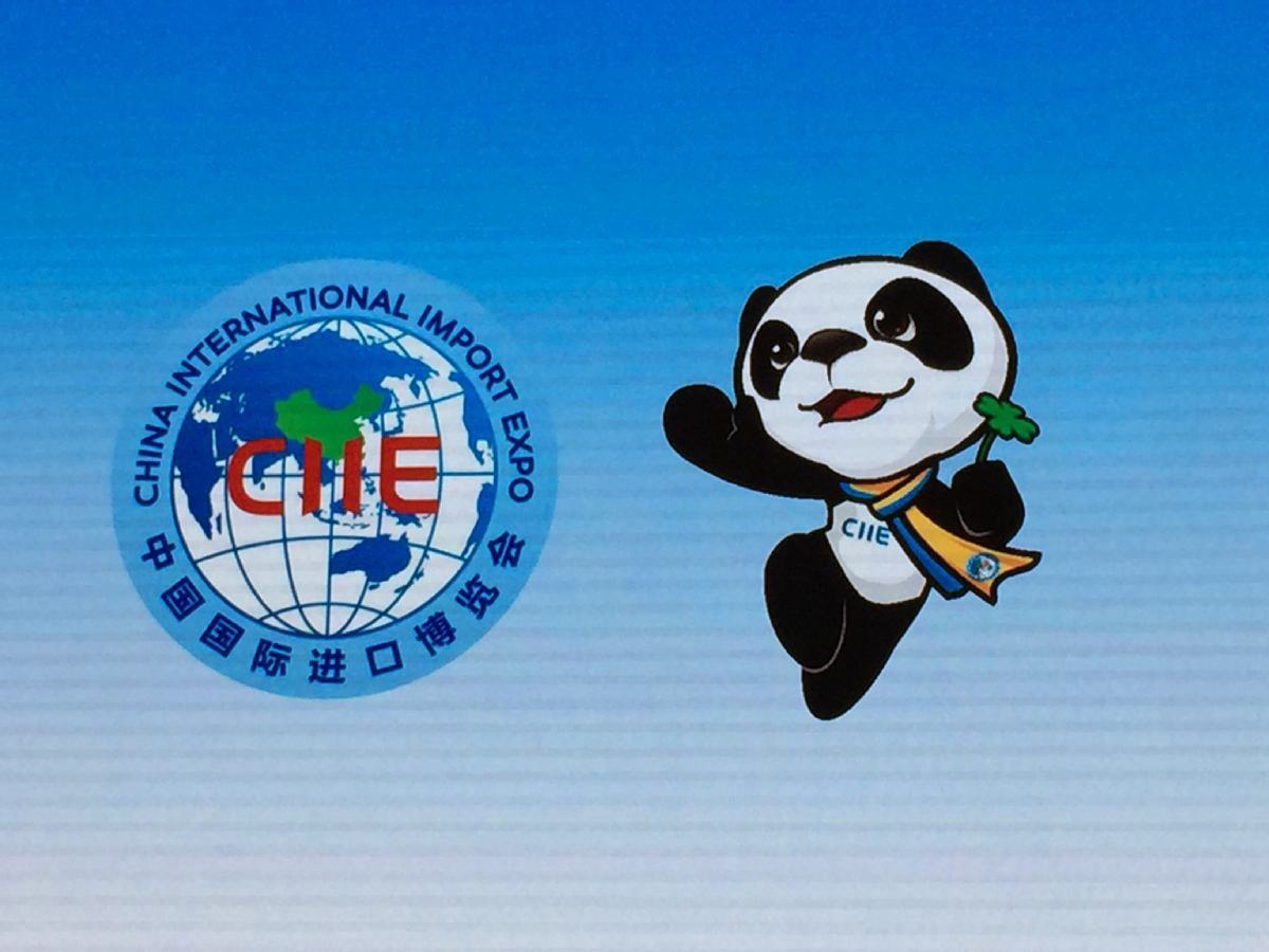 The CIIE logo and mascot Jinbao are showcased at a news conference in Shanghai in this July 27, 2018 file photo. [Photo by Yang Yang/chinadaily.com.cn]