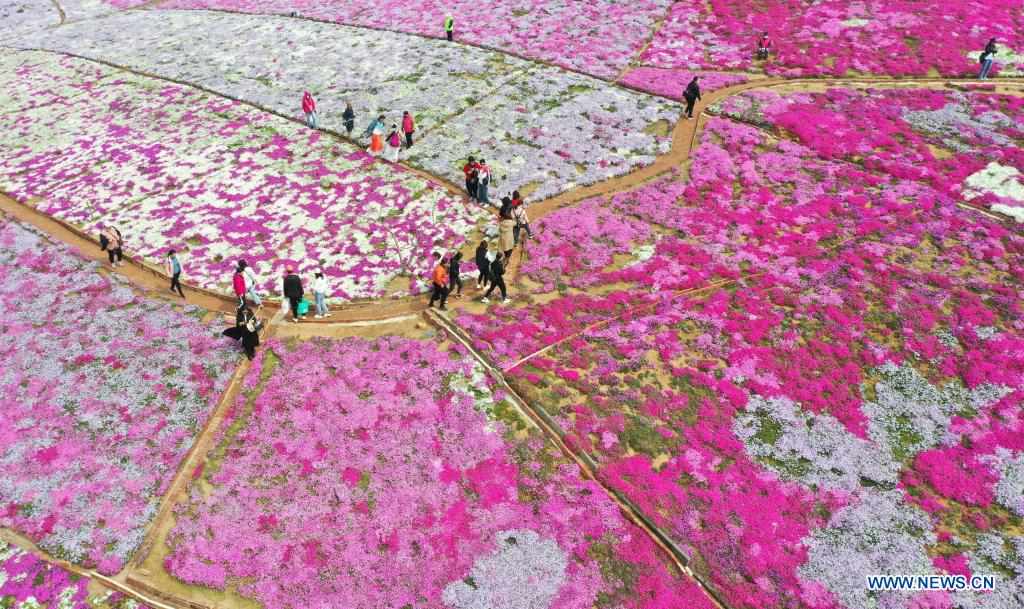Aerial photo taken on April 18, 2021 shows moss pink flowers in full bloom on the bank of the Daheiting reservoir in Qianxi County, Tangshan, north China's Hebei Province. (Xinhua/Yang Shiyao)