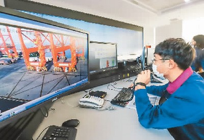 An employee remotely controls equipment at a smart wharf at the Tangshan port in north China's Hebei province. (People’s Daily Online/Liu Mancang)