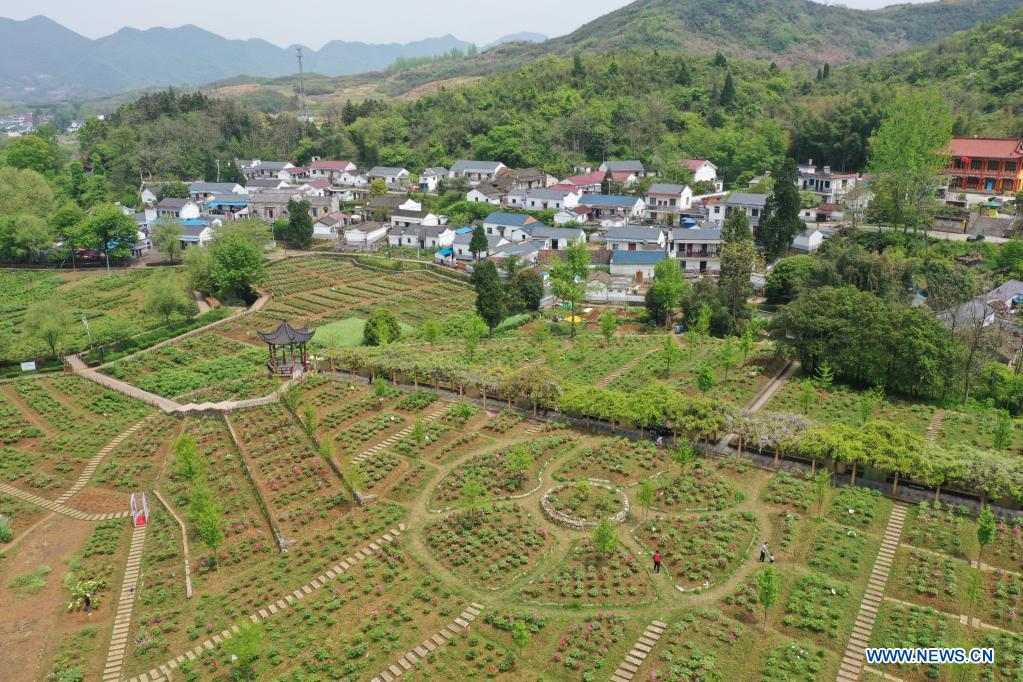 Aerial photo taken on April 15, 2021 shows a peony garden in the Fenghuangshan scenic area in Tongling City, east China's Anhui Province. Tree peony, a long-lived deciduous woody shrub native to China, has many hidden economic potentials under its gorgeous appearance. Tree peony planting, which has a history of more than 1,600 years at Fenghuang Mountain in Tongling City, east China's Anhui Province, has become a new driving force for this city's economic development. (Photo by Zhan Jun/Xinhua)