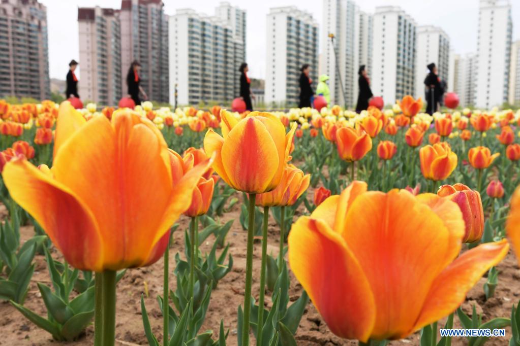 Tulip flowers bloom at Liujiaxia Town of Yongjing County, northwest China's Gansu Province, April 19, 2021. (Photo by Shi Youdong/Xinhua)