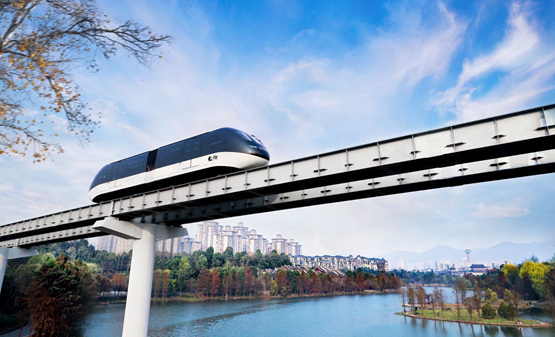 A SkyShuttle train runs along its tracks in Bishan district, southwest China's Chongqing municipality. (Photo/Courtesy of the publicity department of CPC Bishan district committee)