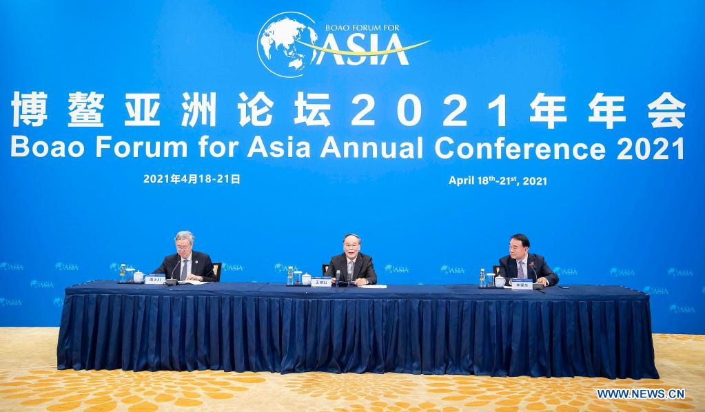 Chinese Vice President Wang Qishan attends the Boao Forum for Asia (BFA) Annual Conference 2021 opening ceremony in Boao, south China's Hainan Province, April 20, 2021. Wang met with members of the BFA board of directors and the forum's strategic partners, and exchanged views with representatives from the business circle. (Xinhua/Li Tao)
