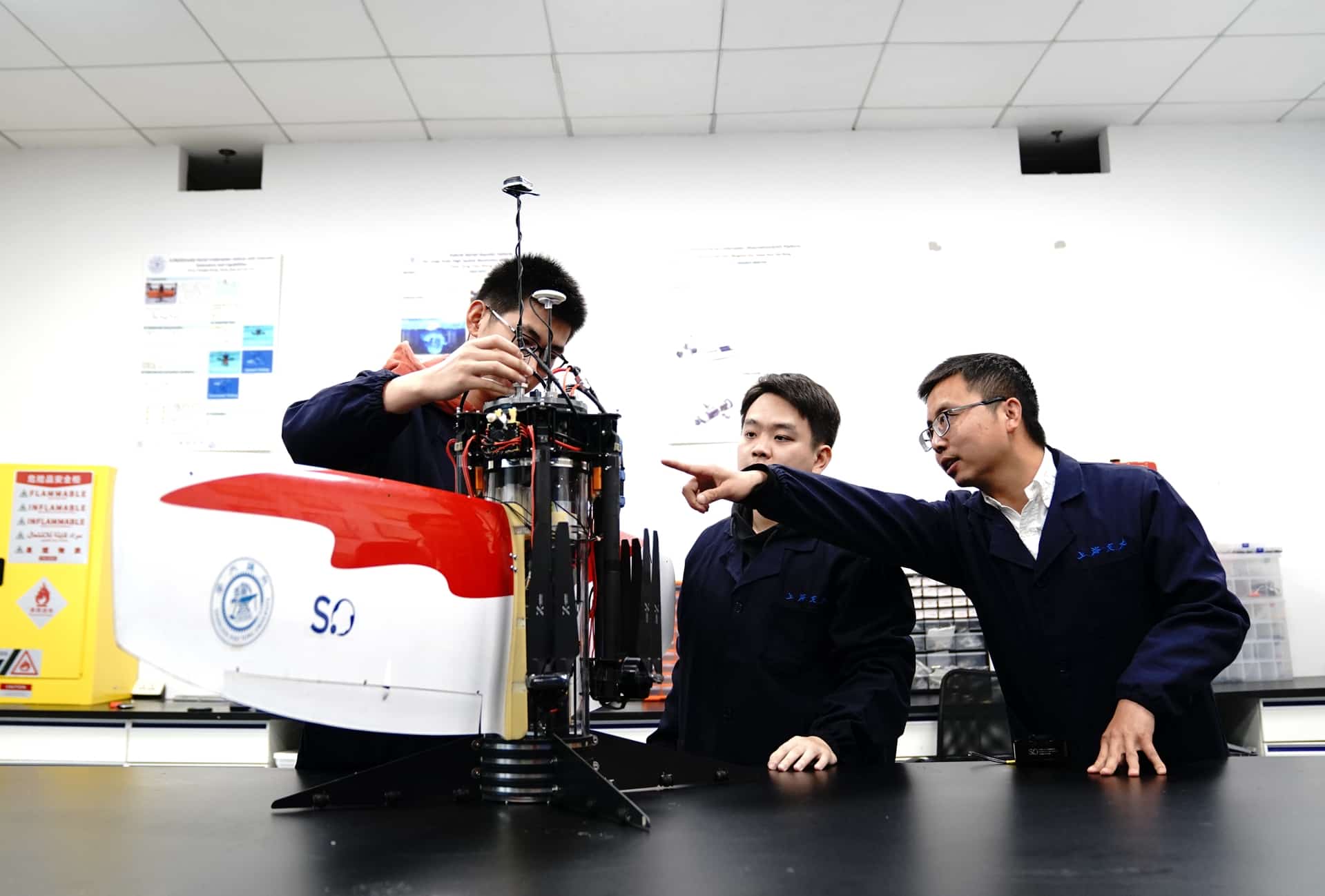 Researchers from the Shanghai Jiaotong University develop an amphibious unmanned aerial vehicle, April 1, 2021. [Photo/Xinhua]