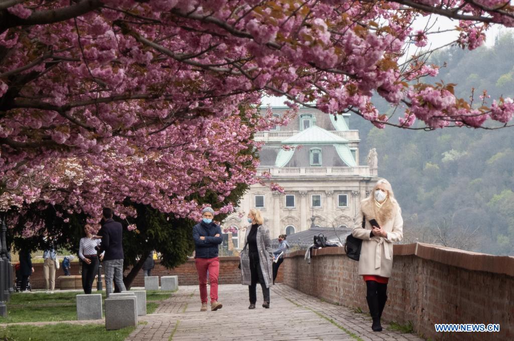 People walk under cherry blossom in the Castle of Buda in Budapest, Hungary on April 19, 2021. (Photo by Attila Volgyi/Xinhua)
