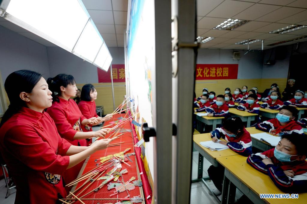 Artists introduce traditional shadow play to students in N China's middle school (2)