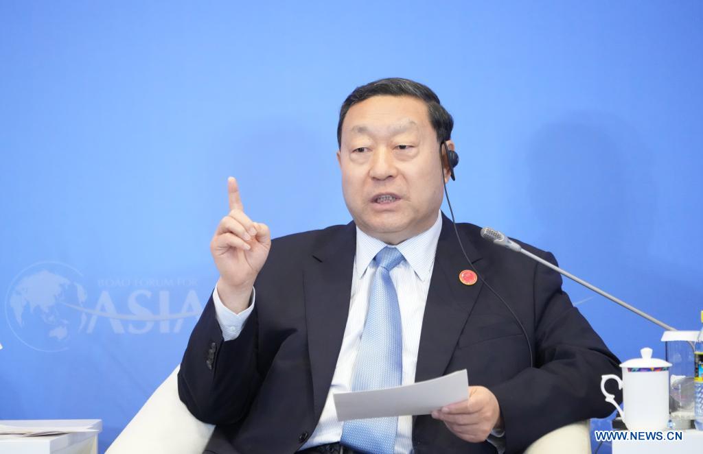 Liu Zhenya, chairman of Global Energy Interconnection Development and Cooperation Organization and chairman of China Electricity Council, speaks at a sub-forum themed on "Accelerate Infrastructure Connection to Unleash Development Potentials" during Boao Forum for Asia annual conference in Boao, south China's Hainan Province, on April 21, 2021. (Xinhua/Cai Yang)