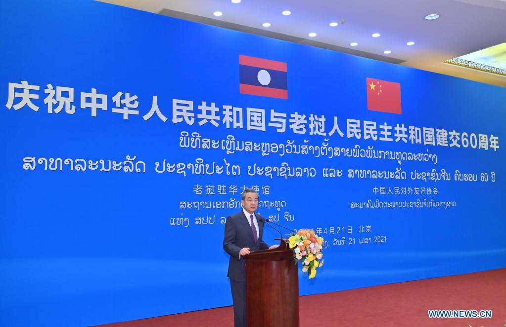 Chinese State Councilor and Foreign Minister Wang Yi delivers a speech at a reception marking the 60th anniversary of diplomatic relations with Laos in Beijing, capital of China, April 21, 2021. The reception was jointly organized by the Chinese People's Association for Friendship with Foreign Countries and the Lao embassy in China. (Xinhua/Yue Yuewei)